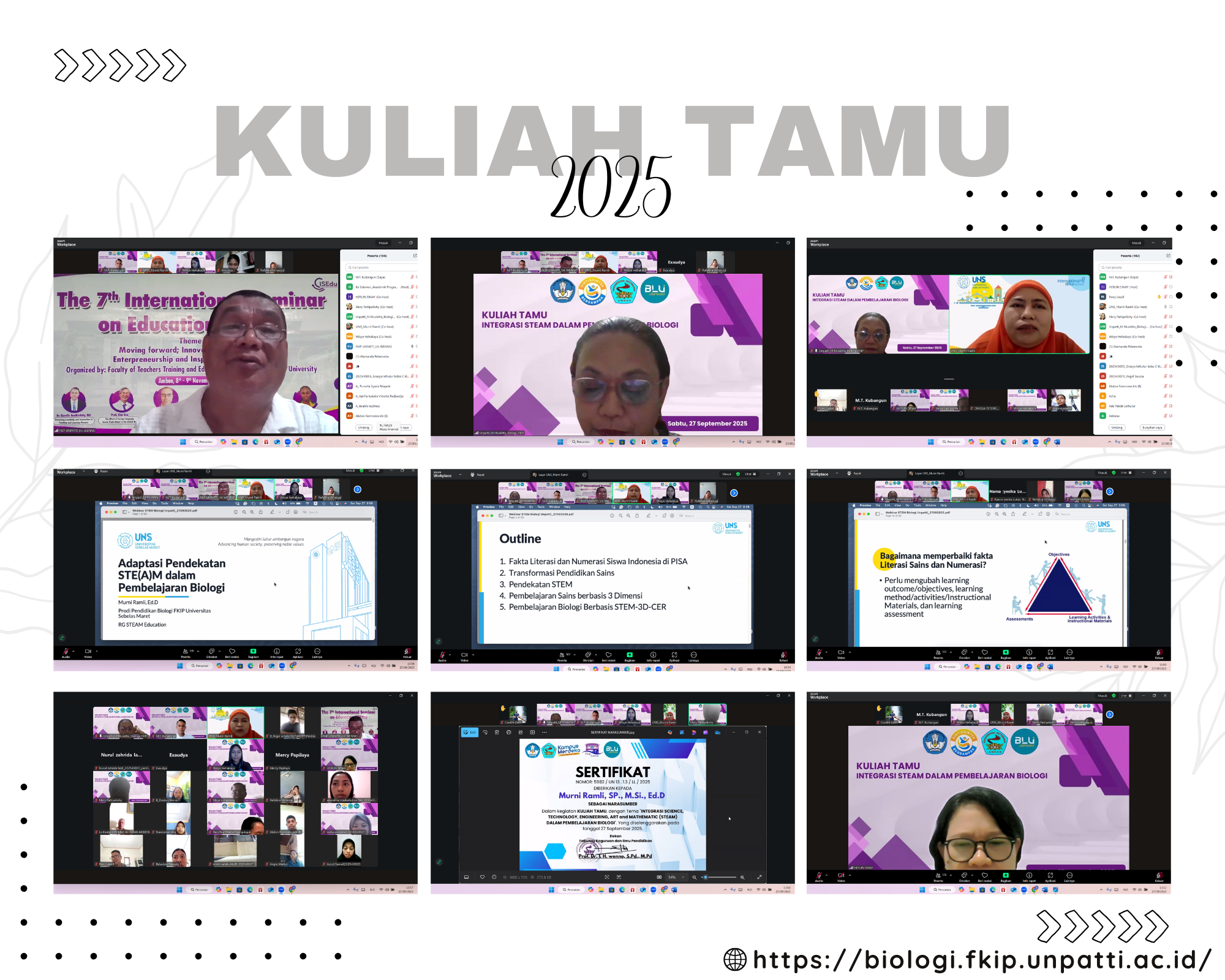 Ambon, 27 September 2025 – Program Studi Pendidikan Biologi FKIP Universitas Pattimura bekerja sama dengan Program Studi Magister Pendidikan Biologi Pascasarjana Universitas Pattimura dan Program Studi Doktor Pendidikan Biologi Pascasarjana Universitas Pattimura menyelenggarakan Kuliah Tamu dengan tema: Integrasi Science, Technology, Engineering, Art, and Mathematics (STEAM) dalam Pembelajaran Biologi bersama Murni Ramli, S.P., M.Si., Ed.D. (Dosen Program Studi Pendidikan Biologi FKIP Universitas Sebelas Maret Solo, Surakarta). Kegiatan ini berlangsung secara daring melalui platform zoom cloud meeting.