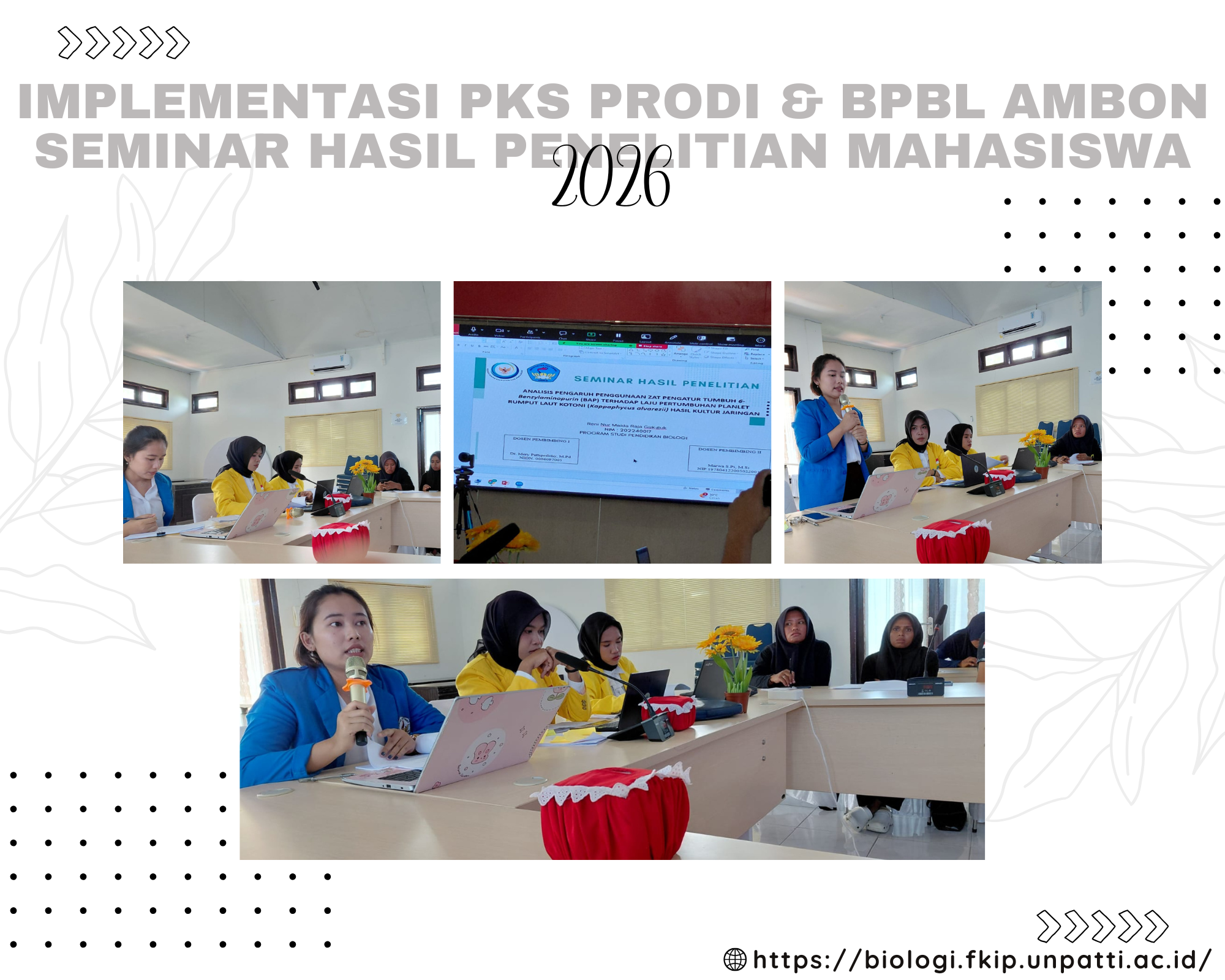 Ambon, 16 April 2026 – Sebagai wujud nyata dari implementasi kerja sama institusional, Program Studi Pendidikan Biologi Universitas Pattimura sukses menyelenggarakan kegiatan Seminar Hasil Penelitian bagi mahasiswa program magang. Kegiatan pemaparan hasil riset ini dilaksanakan di Balai Perikanan Budidaya Laut (BPBL) Ambon pada Hari/Tanggal: Kamis, 16 April 2026.