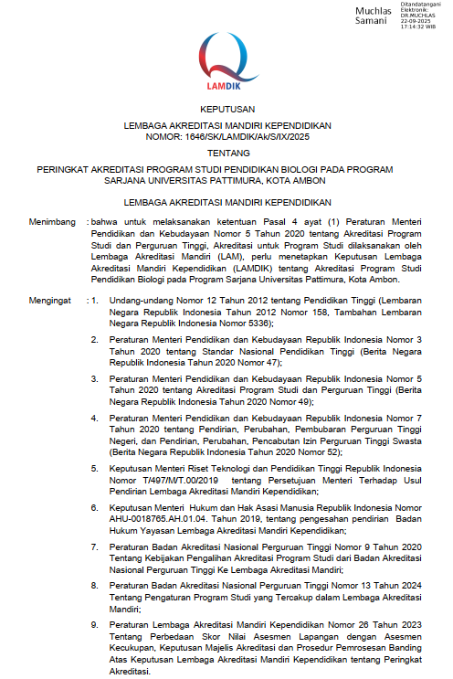 Bedasarkan Surat Keputusan Lembaga Akreditasi Mandiri Kependidikan (LAM-DIK) Nomor: 1646/SK/LAMDIK/Ak/S/IX/2025, menyatakan bahwa Program Studi Pendidikan Biologi, pada Program Sarjana Universitas Pattimura, Kota Ambon Terakreditasi dengan Peringkat Akreditasi Unggul.