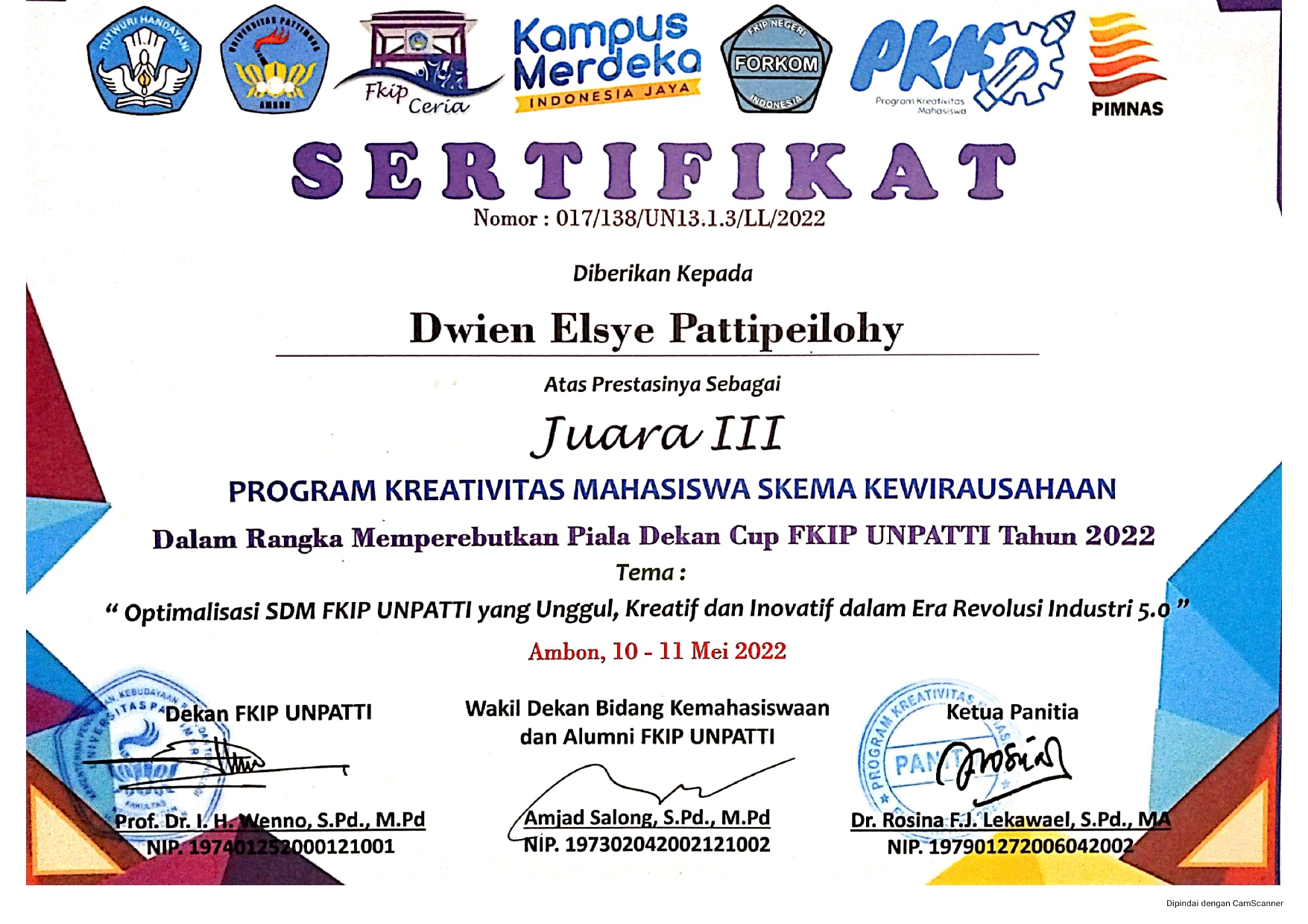 Dwien Elsye Pattipeilohy, Juara III Program Kreativitas Mahasiswa SKEMA-Kewirausahaan Piala Dekan Tahun 2022 MTK2 Desember 2025 Facebook Twitter WhatsApp Pinterest